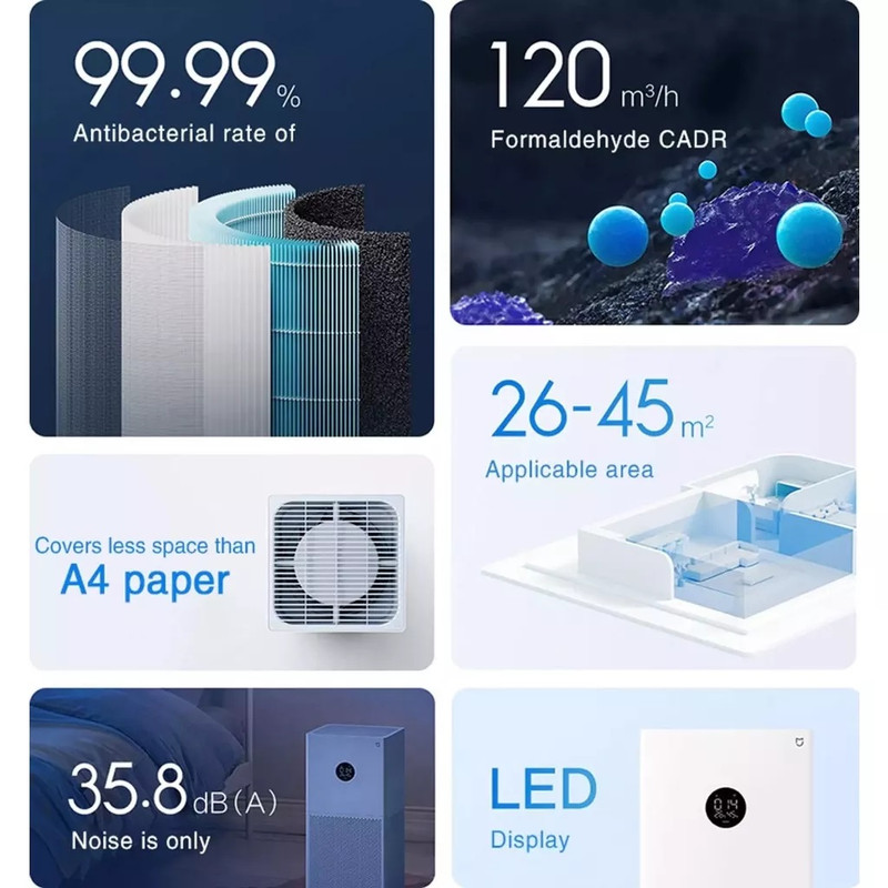 دستگاه تصفیه هوا شیائومی مدل Air Purifier 4 Lite با ظرفیت تصفیه 360 متر مکعب در ساعت، قادر به ارائه 6000 لیتر هوای تمیز در هر دقیقه می باشد. با این دستگاه هوشمند، با همه خطراتی که دستگاه تنفسی را تهدید می کند، خداحافظی کنید و به زندگی پاک و سالم با تنفس هوای تازه قدم بگذارید. با پشتیبانی از کنترل هوشمند و نصب برنامه Mi Home روی تلفن هوشمند خود، از هر کجا که هستید، می توانید تصفیه سازی هوای خانه را فعال نمایید و اطمینان حاصل کنید که همیشه به خانهای پر از هوای تمیز و تازه باز میگردید. صفحه نمایش LED تعبیه شده روی بدنه دستگاه، به شما این امکان را می دهد تا دما و رطوبت داخل ساختمان، ارتباط وای فای و وضعیت عملکرد دستگاه را چک نمایید. عملکرد آرام دستگاه با نویزی کم به اندازه 33.4 دسی بل، امکان استفاده از آن را در هر ساعتی از شبانه روز، حتی در سکوت شب فراهم می نماید. فیلتر سه لایه این محصول، به خوبی از پس تصفیه انواع بوها و ذرات ریز 0.3 میکرومتری معلق در هوا بر می آید